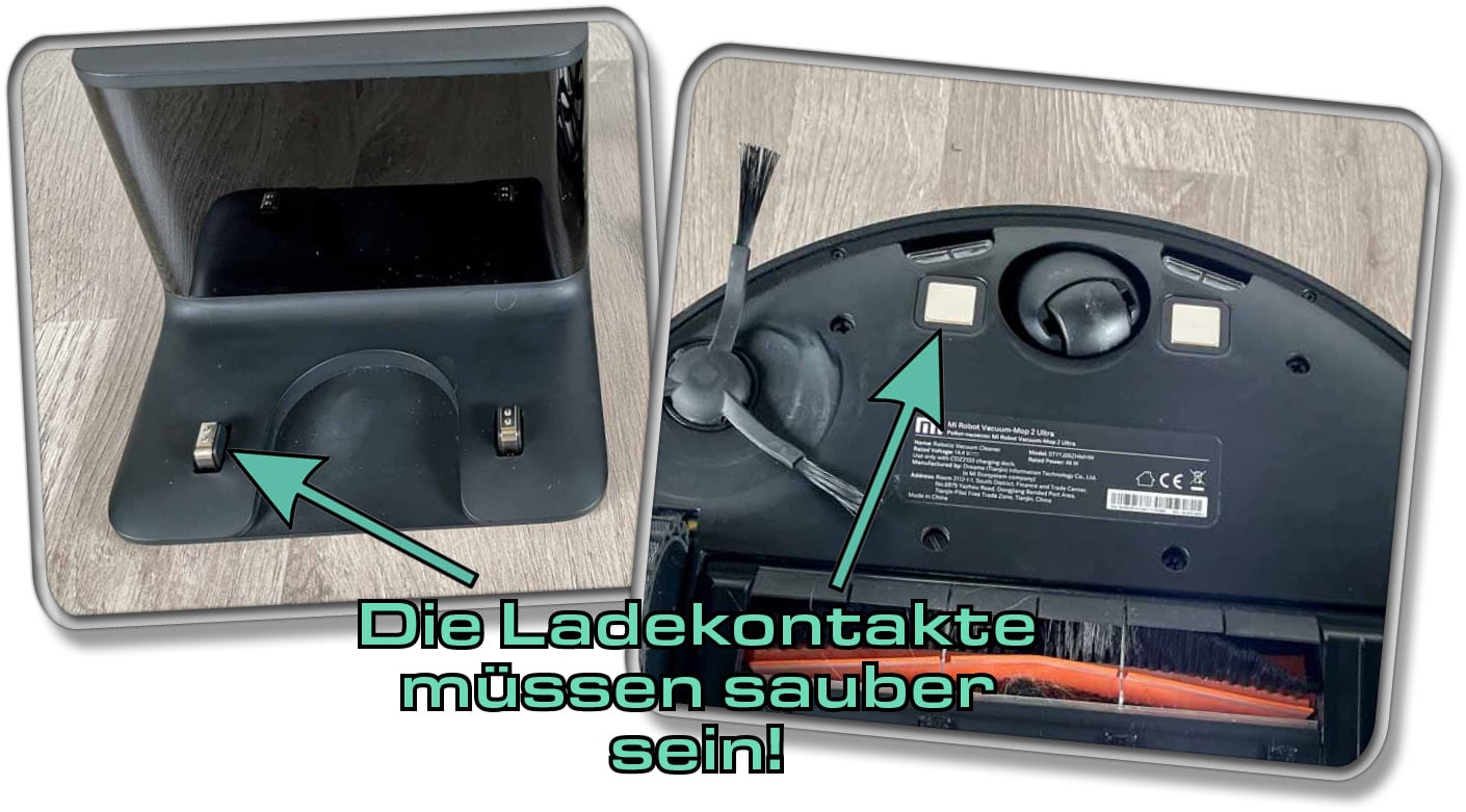 Oftmals kann der Xiaomi Saugroboter nicht mehr an seiner Ladestation andocken, weil Verschmutzung den Kontakt der Ladekontakte behindert. Befindet sich eine leichte Schmutzschicht auf diesen, könnte das der Saugroboter bemerken, weil der Strom nicht mehr ordentlich fließt. Reinige die Ladekontakte unter dem Saugroboter und auf der Ladestation mit einem feuchten Tuch. Bitte trenne vorher die Ladestation vom Strom! So könnte der Saugroboter die Station direkt danach wiederfinden.