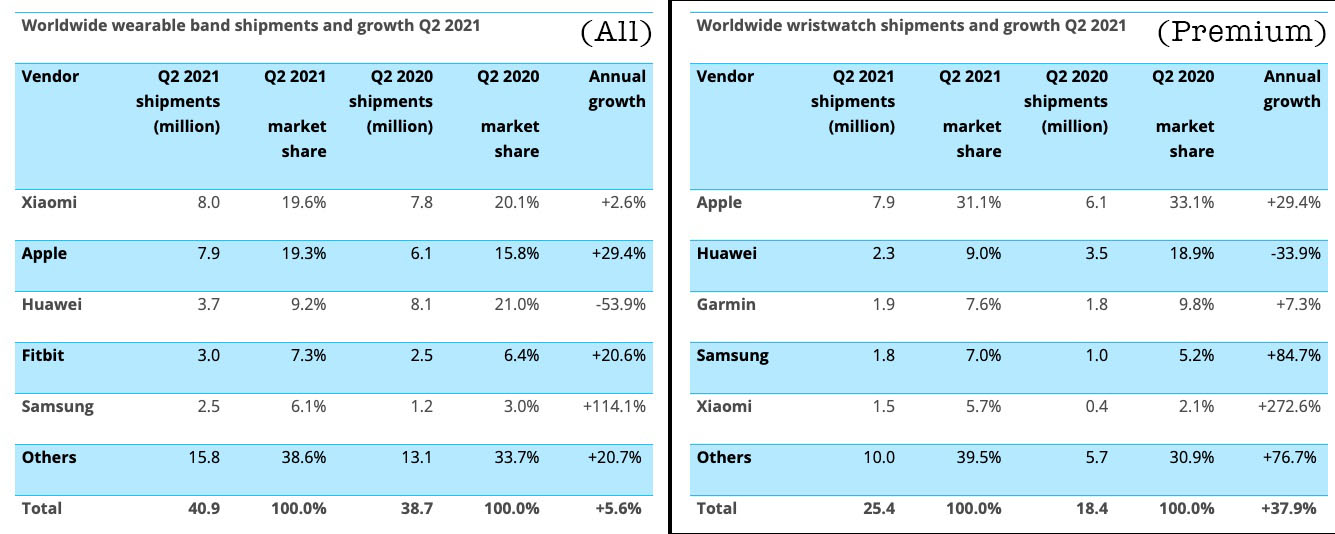 Trennt man nach Basisbändern – also Low-End-Modelle wie von Xiaomi und Fitbit – von vollständigen Smartwatches, liegt Apple weiterhin mit einem Marktanteil von 31,1 % mit großem Vorsprung auf dem ersten Rang. Huawei kommt auf dem zweiten Platz gerade einmal auf 9 % und Xiaomi auf magere 5,7 %.
