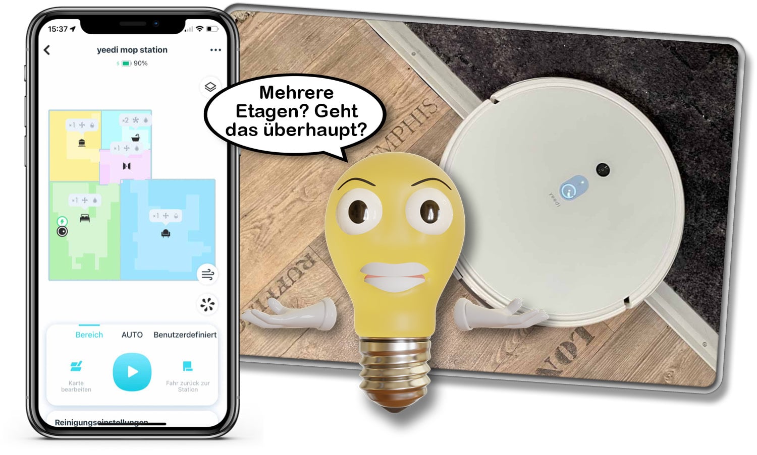 Auch das ist nicht möglich. Ich habe es selbst getestet. In meinem Test habe ich den yeedi mop station, der mir vor einiger Zeit zum Test zur Verfügung gestellt wurde, in eine andere Etage gestellt und einfach auf Start gedrückt. Kurz darauf hat der yeedi mop station seine Position auf der abgespeicherten Etage ermitteln wollen. So fuhr er feuchtfröhlich herum, bis er dachte, er habe seinen Standpunkt jetzt ermittelt.