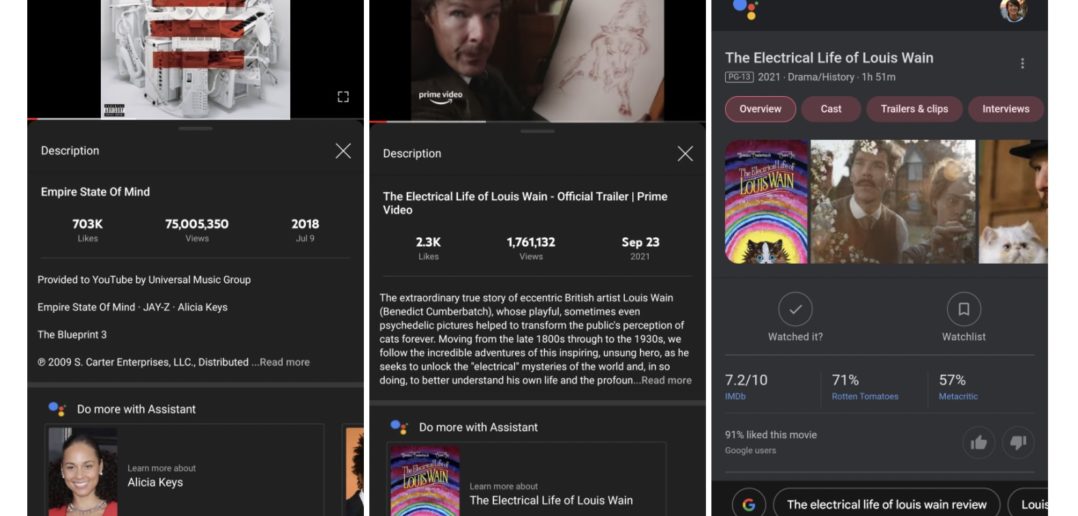 Unter dem Motto „Mit Assistant mehr erreichen“ kann man den Sprachassistenten aktivieren. Vorausgesetzt man ist Premium-Abonnent. Bei bestimmten Videos werden beim Öffnen der Videobeschreibung und beim Herunterscrollen Vorschläge über beispielsweise Filme, Personen oder Orte angezeigt. Klickt man dann auf den Vorschlag, wird eine Google Assistant-Suche gestartet und ein Knowledge Graph-Feld angezeigt.