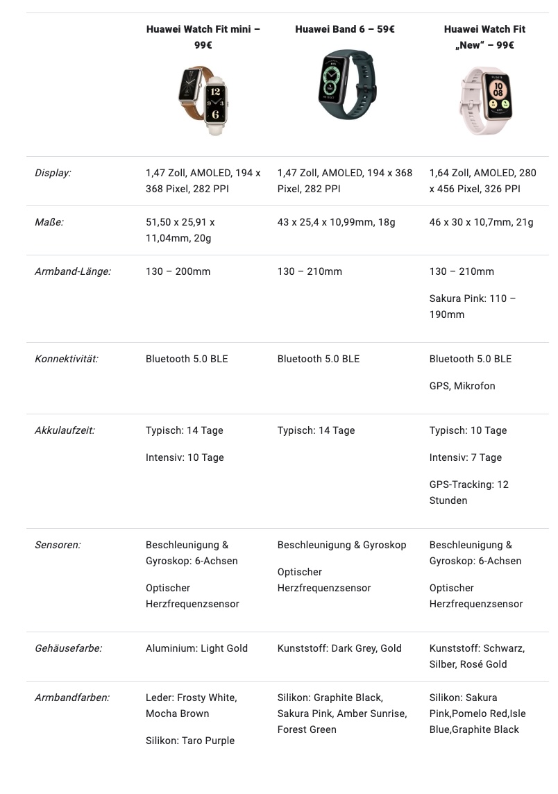 Die neue Huawei Watch Fit mini kommt mit einem edlen Metallgehäuse und schickem Leder- oder Fluoroelastromer-Armband. Es ist wohl der vermeintliche Nachfolger des Huawei Band 6, dass ja aus Kunstoff besteht und schon für unter 60 € zu haben ist. Für das schickere Aussehen will Huawei 99 €, wobei du hier dann ein eleganteres Aussehen gegen GPS eintauschst. Das ist bei der neuen Huawei Watch Fit mini nämlich nicht mit integriert. Auch hat sich weder an den Funktionen noch an der Hardware etwas im Vergleich zum Huawei Band 6 verändert, sodass es sich bei der Huawei Watch Fit mini – trotz der Namensgebung – meiner Meinung nach eher um einen schickeren Fitnesstracker im Uhrendesign als eine Smartwatch handelt. Als Farbauswahl stehen Frosty White, Mocha Brown und Taro Purple zur Verfügung.
